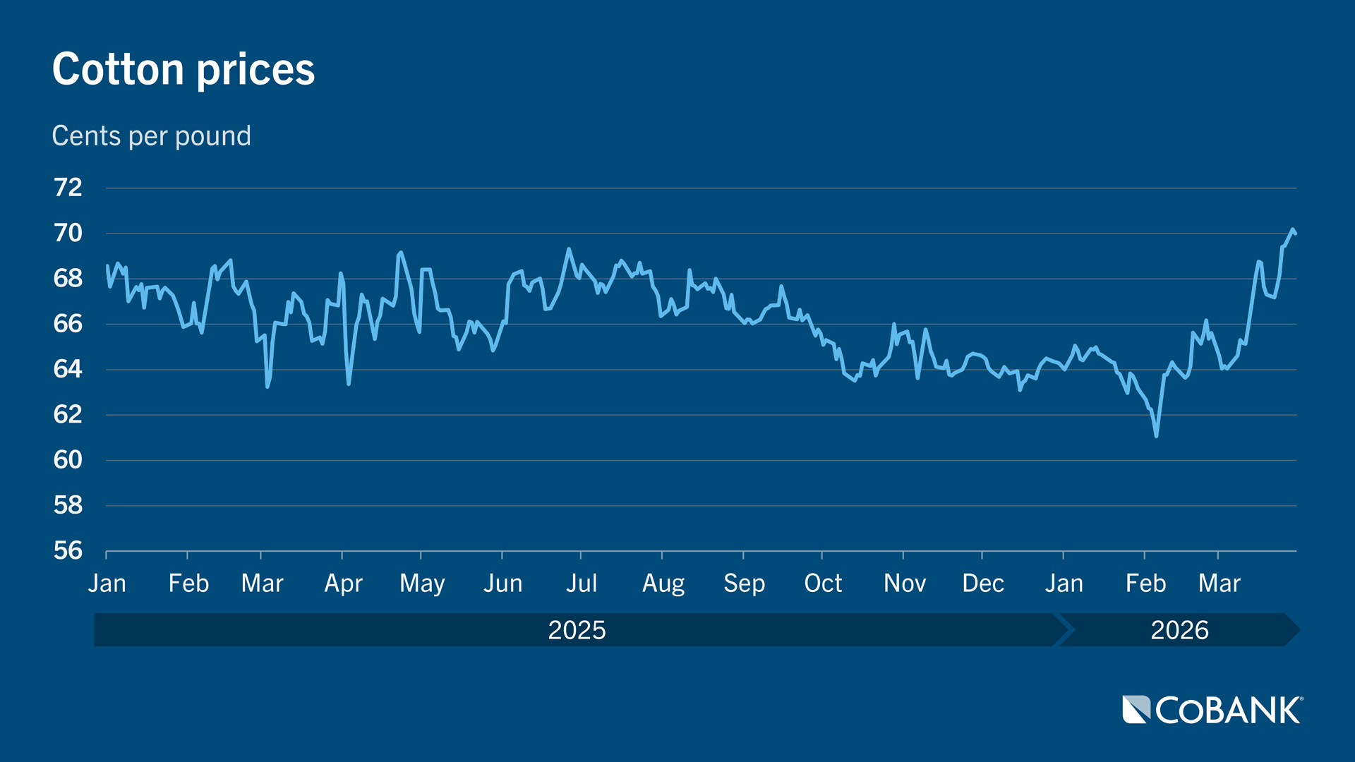 Cotton prices rebounded last quarter, rising 5.7 cents per pound (8.9%), in line with broader commodity gains. The rally was driven largely by speculators hedging against inflation following the tumult in Iran. U.S. farmers indicated they plan to increase cotton acreage in 2026, defying expectations for cuts as returns lag other crops.